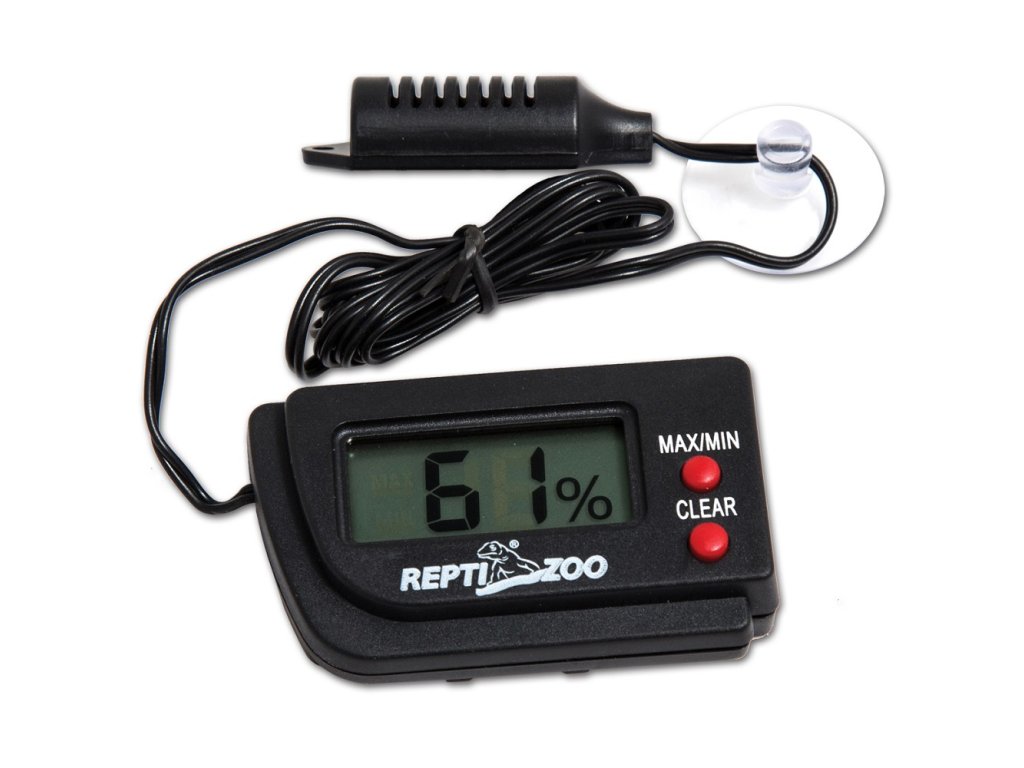 Digitální měřič úrovně vlhkosti prostředí terária v rozpětí 20-99% se zabudovanou pamětí pro maximální a minimální naměřenou vlhkost.