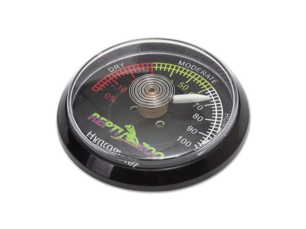 Analogový vlhkoměr s kovovým čipem určený k měření vlhkosti uvnitř terária.