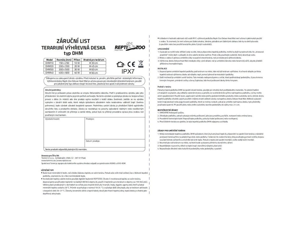 Voděodolná tepelná podložka určená k vytvoření a udržení tepelného komfortu v teráriu. Díky své ploché konstrukci umožňuje rovnoměrné vyhřívání většího prostoru.
