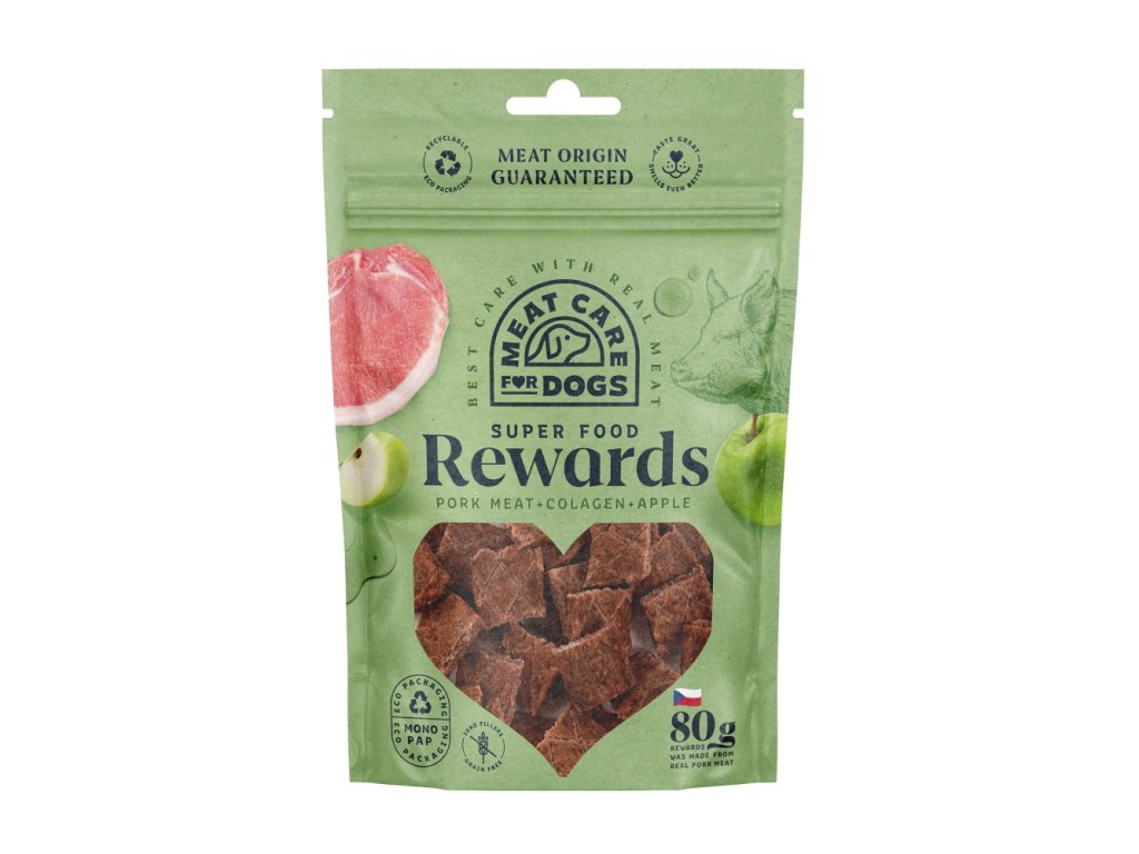 Rewards Dog vepřové s jablky a kolagenem je pamlsek ze skutečného čerstvého masa. Vepřové maso v kombinaci s vysokým obsahem přírodního kolagenu pro zdravé klouby a kosti.