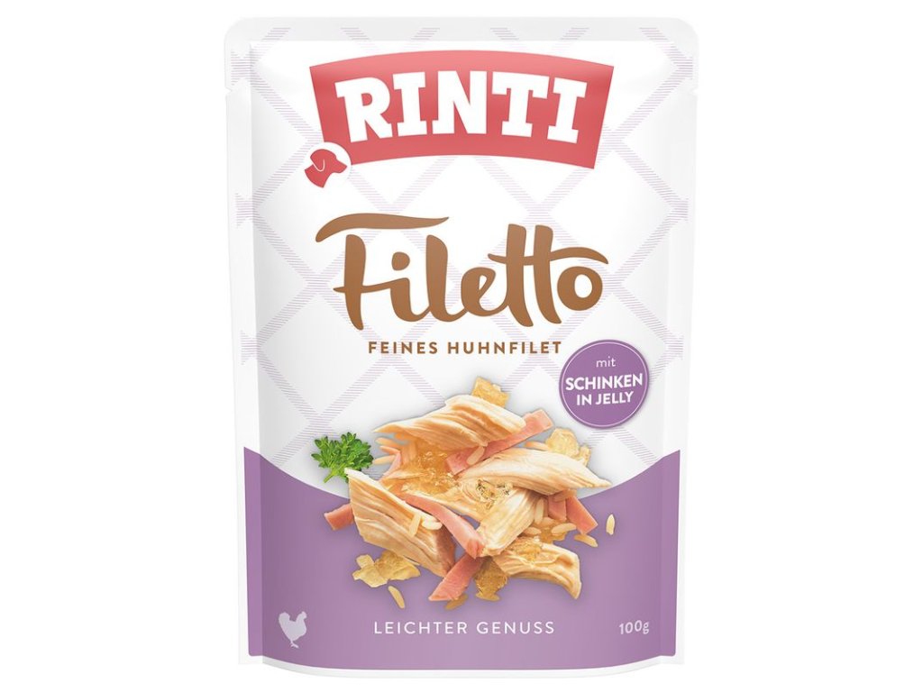 Doplňkové krmivo pro dospělé psy Rinti Filetto v podobě kousků kuřete a šunky v lahodném želé. Kapsička Rinti Filetto v praktickém balení se hodí například k ochucení suchých granulí nebo jen tak pro radost vašeho psího přítele.