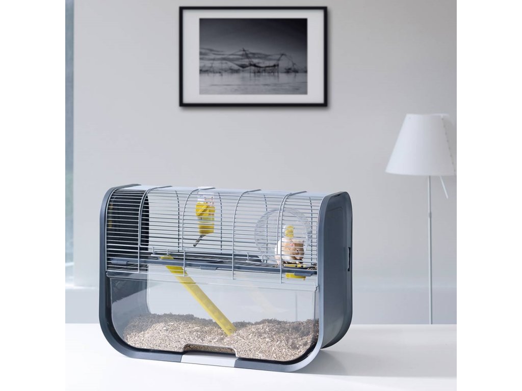 Klec je velikostí vhodná pro křečky. Její moderní design a jedinečný koncept se bude hodit do každé domácnosti, zatímco průhledné plastové dno umožňuje vidět, jak si váš křečík hraje nebo odpočívá.