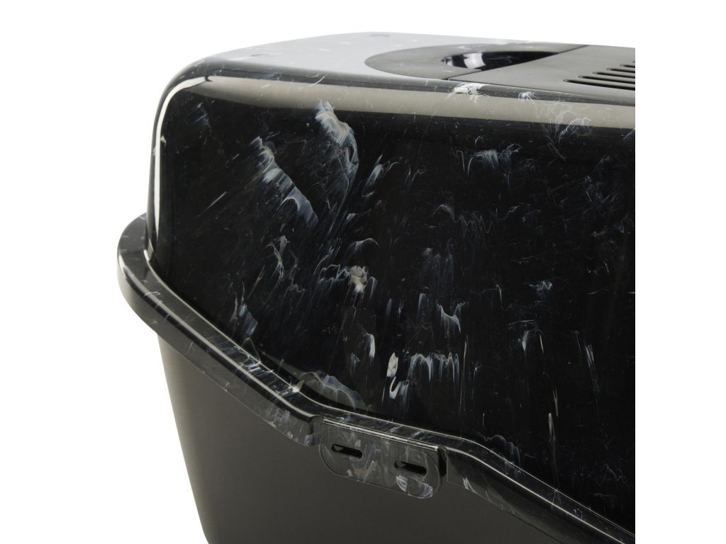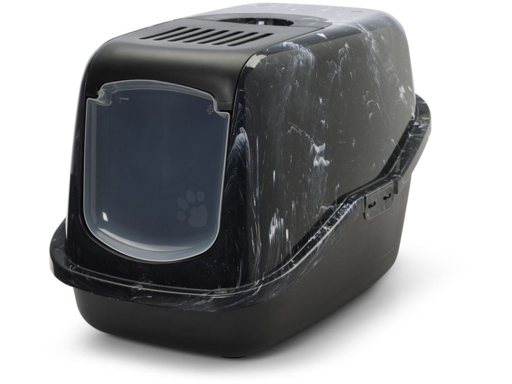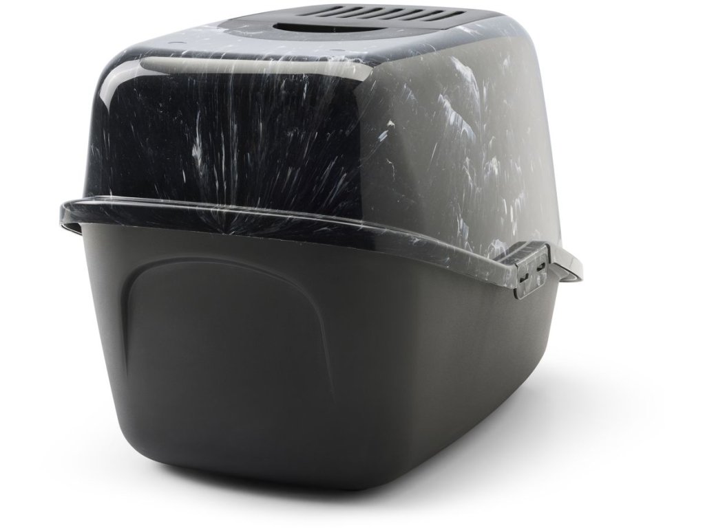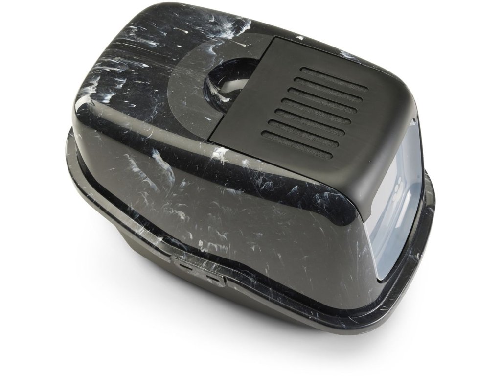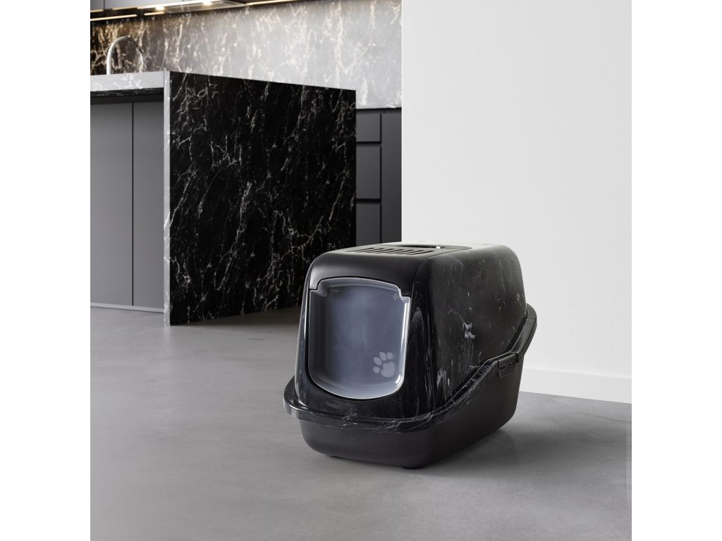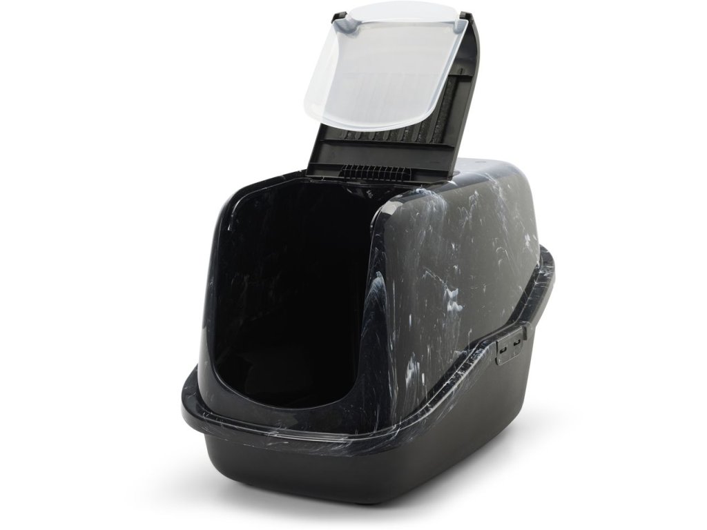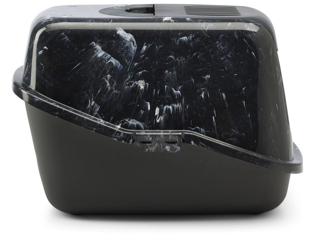 Toaleta pro kočky v moderních vzhledu ušlechtilého černého mramoru, s odklápěcím krytem pro jednoduché a rychlé čištění, s filtrem z aktivního uhlí.