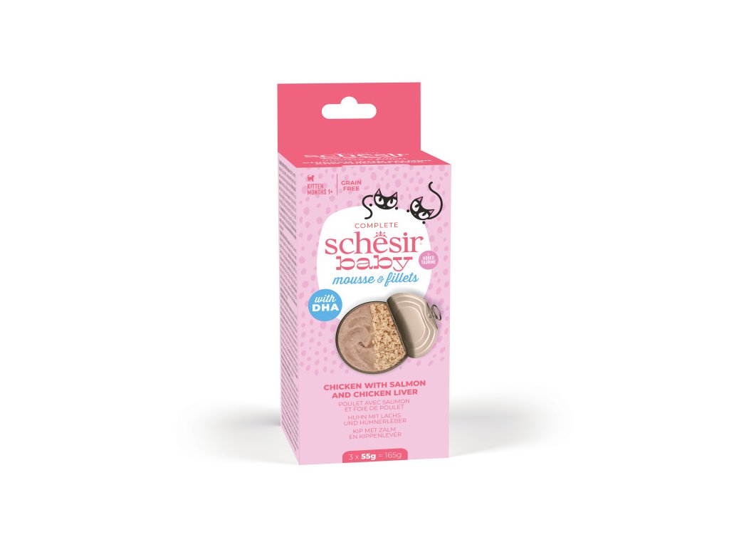 Již od prvního roku života potřebuje kotě podporu ve vývoji a doprovod při přechodu z mateřského mléka do úplného odstavení. To je důvod, proč Schesir Baby nabízí kompletní a vyvážené receptury s jemnou texturou, formulované tak, aby uspokojily specifické potřeby kotěte již od prvních týdnů života. Obsahuje taurin pro podporu růstu a DHA pro podporu správného vývoje mozku. Je založen na skutečné masové bílkovině v kombinaci s dalšími důležitými složkami a neobsahuje žádné obiloviny.