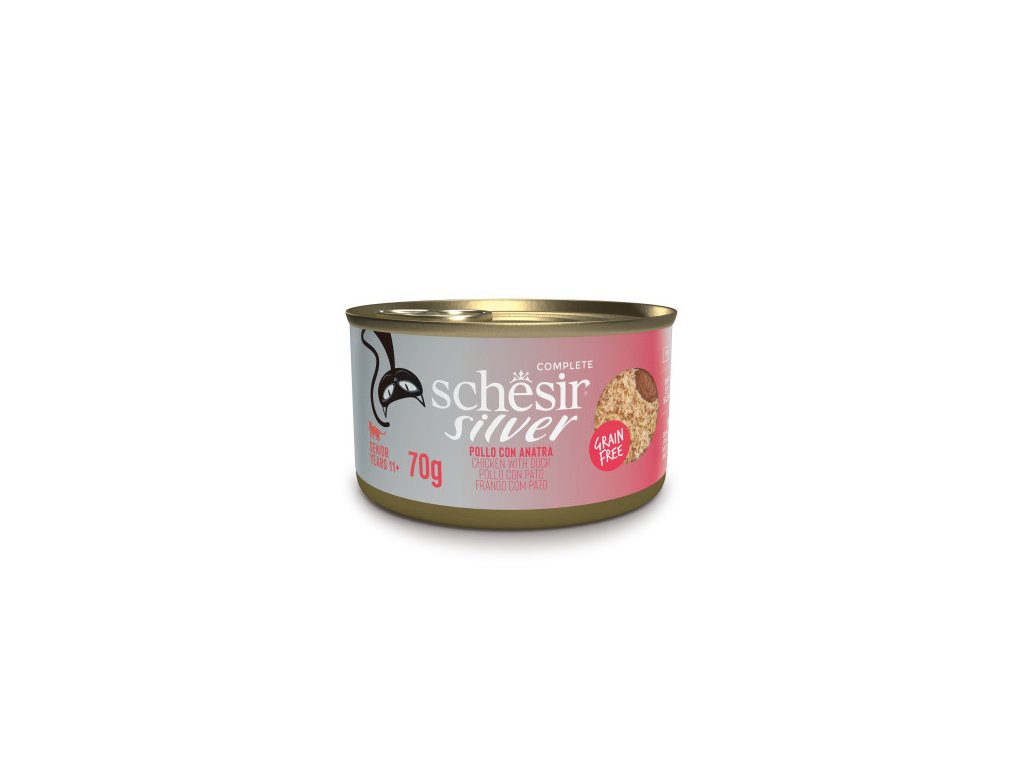 Od jedenáctého roku života mají kočky specifické nutriční potřeby spojené s jejich věkem, takže správná strava pro tyto potřeby je důležitá. Schesir Silver je řada kompletních a vyvážených receptur pro kočky ve věku 11 a více let, navržená pro podporu fungování jejich imunitního systému. Je založen na skutečné masové bílkovině v kombinaci s dalšími důležitými složkami. Neobsahuje žádné obiloviny.