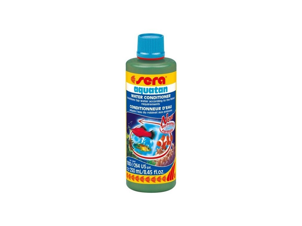 Stabilizátor Sera Aquatan z vodovodní vody v okamžiku připraví zdravou a čistou vodu pro sladkovodní a mořská akvária. Aquatan s novou bio-ochrannou recepturou také usnadňuje údržbu akvárií, která chovatele stojí méně námahy. Díky neutrálnímu pH je zajištěn bezproblémový transport ryb. Sera Aquatan přispívá pestrému vybarvení ryb a jejich celkové vitalitě. Zmírňuje stres u ryb a má celkově pozitivní vliv na funkce nervového systému.