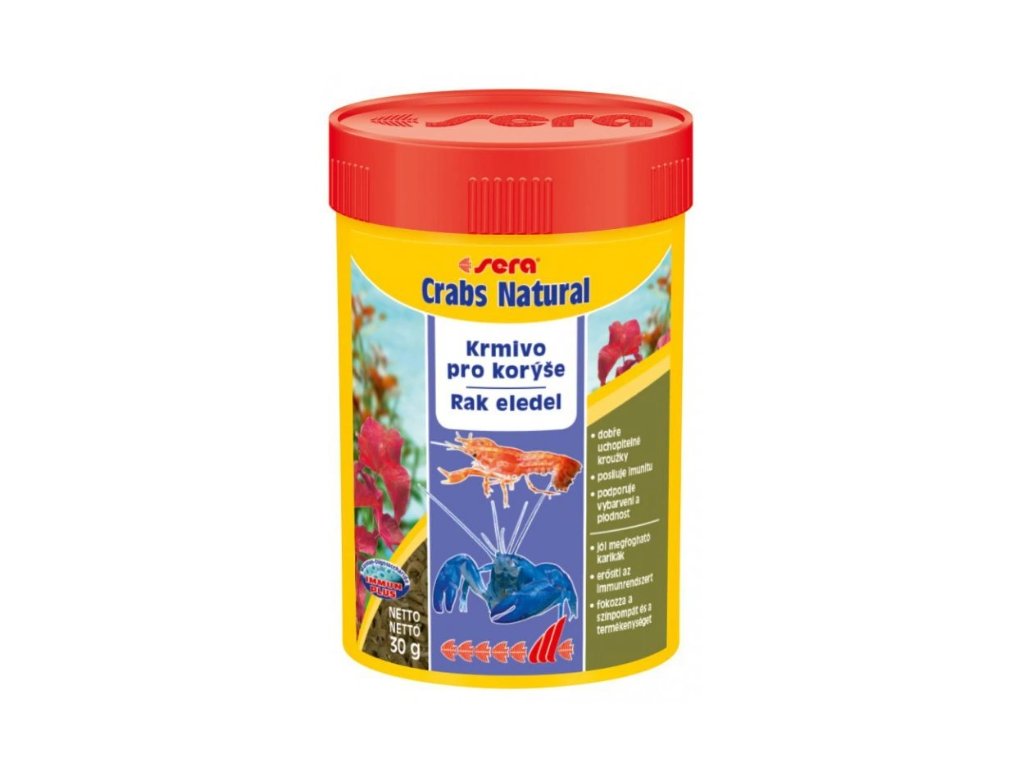 Sera Crabs Natural je kompletní krmivo pro korýše. Rychle klesající kousky jsou vhodné pro korýše ve sladkovodním i mořském akváriu, tak i pro kraby poustevníčky. Rychle klesající stabilní kroužky nezatěžují vodu a korýši si je mohou snadno uchopit a odkusovat. Díky přírodním a vysoce kvalitním ingrediencím, jako je např. spirulina je zaručen zdravý vývoj, brilantní vybarvení plodnost a vitalita.