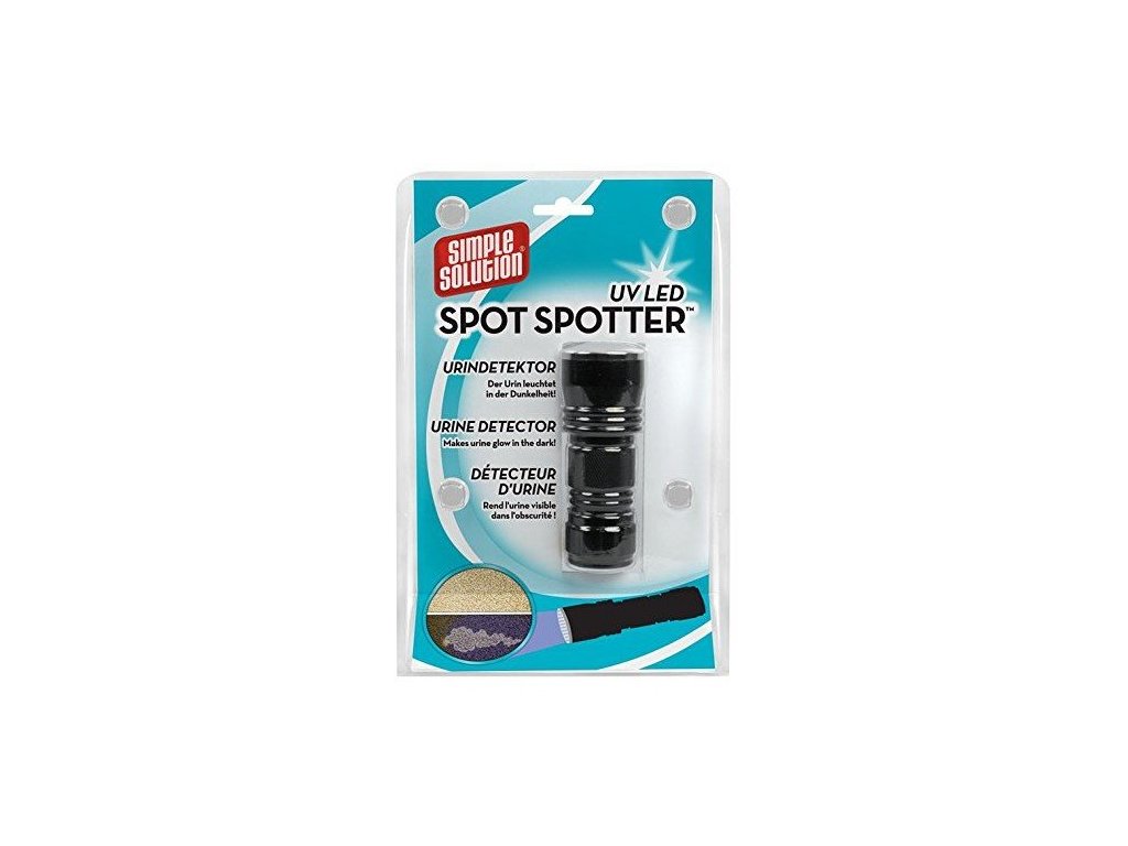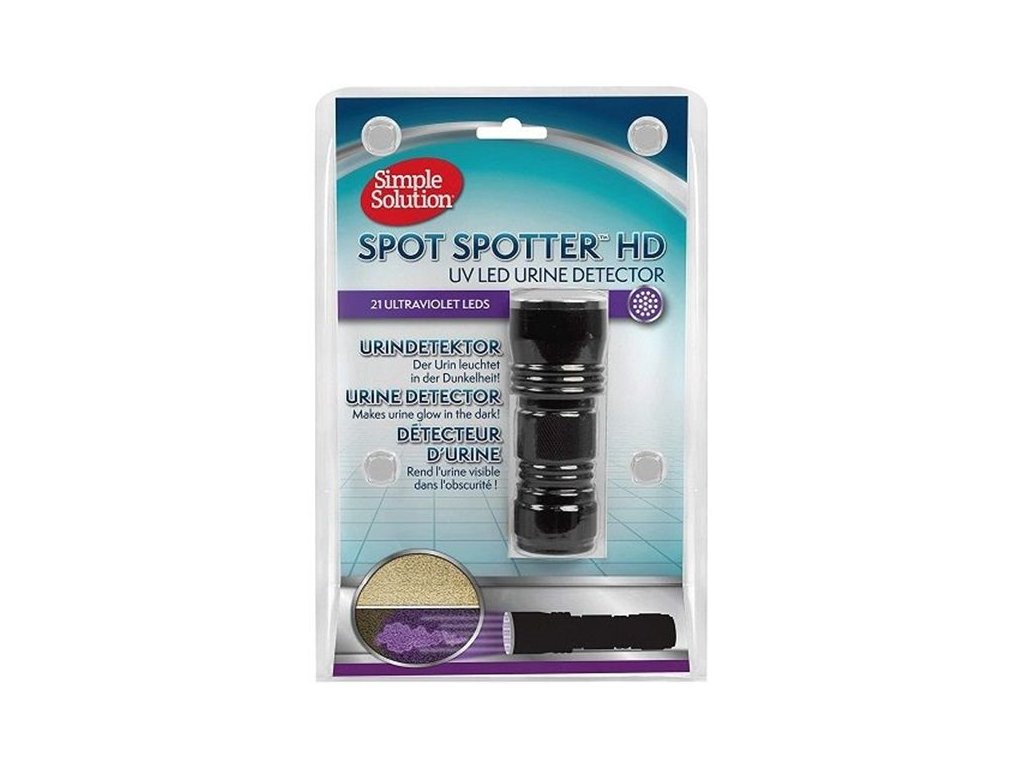 Detektor moči Spot Spotter HD UV je navržen jako baterka. Odšroubujte spodní uzávěr a nainstalujte tři baterie AAA. Baterku zapněte a posviťte si na koberec nebo na jiný povrch. Pomůže vám najít zdroj nepříjemných zápachů v domácnosti a usnadní jejich odstranění. Pro nejlepší výsledky by měla být místnost co nejtmavší. Pro odstraněných skvrn použijte Simple Solution Stain & Odor Remover - Enzymatický odstraňovač skvrn a pachů pro psy, 750ml