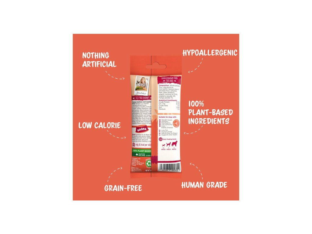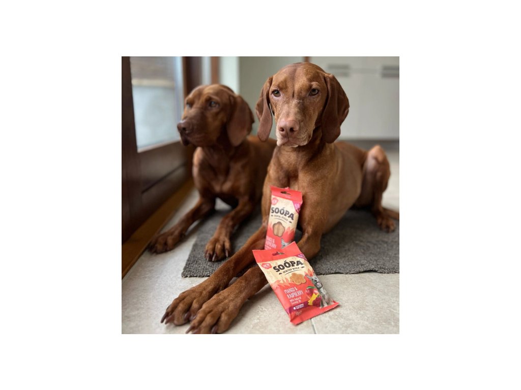 Soopa jsou 100% přírodní, bez obilovin, umělých barviv a dochucovadel. Díky nízkému obsahu tuku a proteinu jsou vhodné i pro psy s citlivým zažíváním, alergií na živočišné bílkoviny nebo nízkoproteinovou dietou.