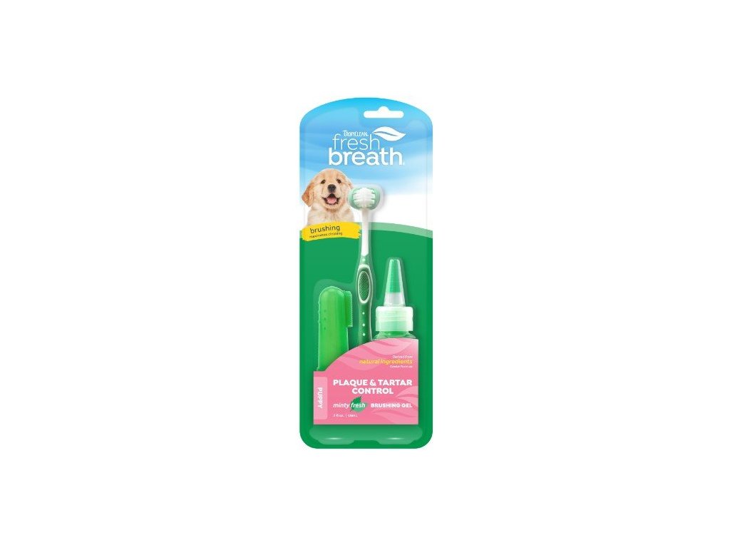 Zubní hygienu se vyplatí začít dodržovat už od štěněte. Pro ideální dentální péči je tu sada Tropiclean set na čištění zubů Fresh Breath pro štěňata, která obsahuje čistící gel na zuby, QuickFinger kartáček na prst a TripleFlex kartáček. Můžete si tedy vybrat, co bude lépe vašemu štěněti vyhovovat. Čistící gel, vyrobený z přírodních složek, pomáhá odstraňovat zubní plak i kámen. Díky mentolu a extraktu z lístků zeleného čaje navíc pejskovi zpříjemní dech. Aplikace je velmi jednoduchá. Stačí dát malé množství gelu na kartáček, který více psovi a vám vyhovuje, a čistit krouživými pohyby. Pro zvýšení účinku po použití zubní péče Tropiclean, odstraňte z dosahu psa na půl hodiny jídlo i vodu. Čistí gel je určen výhradně pro psy!