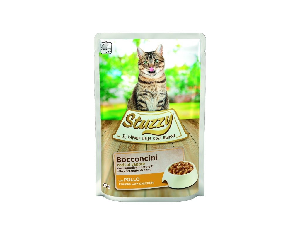 Vlhké krmivo pro kočky s příchutí kuřete je speciálně připravováno v páře. Italské kapsičky Stuzzy zachutnají i té nejmlsnější kočičce. Složení kapsičky je speciálně upraveno tak, aby splňovalo výživové požadavky dospělých koček. Kapsičky označené jako Bocconcini obsahují pouze pomalu přírodní suroviny, které jsou dušeny v páře.