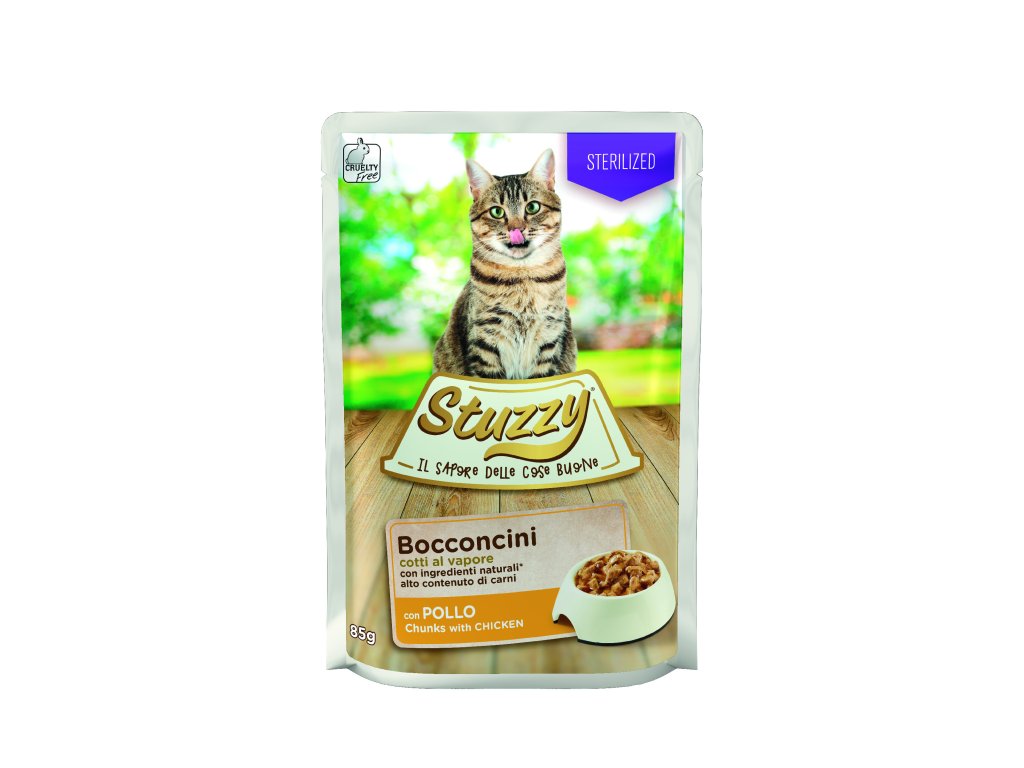Vlhké krmivo pro kočky s příchutí kuřete je speciálně připravováno v páře a je ideální pro kastrované kočky. Italské kapsičky Stuzzy zachutnají i té nejmlsnější kočičce. Složení kapsičky je speciálně upraveno tak, aby splňovalo výživové požadavky dospělých koček. Kapsičky označené jako Bocconcini obsahují pouze pomalu přírodní suroviny, které jsou dušeny v páře.