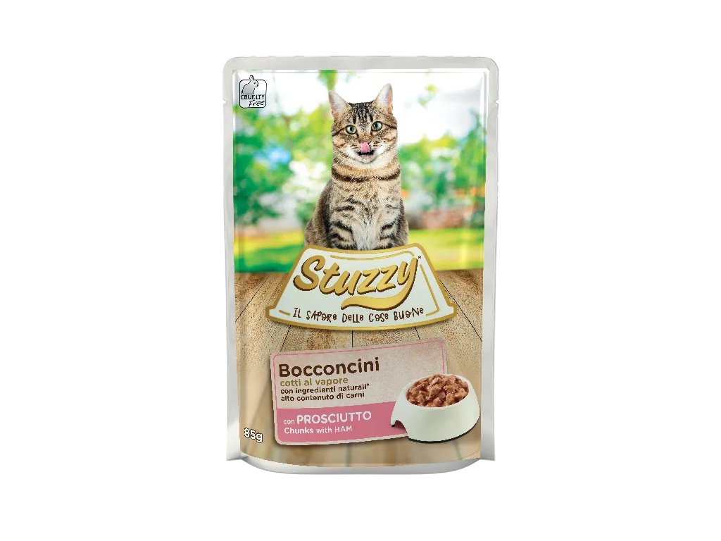 Vlhké krmivo pro kočky s příchutí šunky prosciutto je speciálně připravováno v páře. Italské kapsičky Stuzzy zachutnají i té nejmlsnější kočičce. Složení kapsičky je speciálně upraveno tak, aby splňovalo výživové požadavky dospělých koček. Kapsičky označené jako Sfilaccetti obsahují pouze pomalu vařené přírodní ingredience a jsou bohaté na chuť a živiny (jedinečný zážitek skutečné chuti).