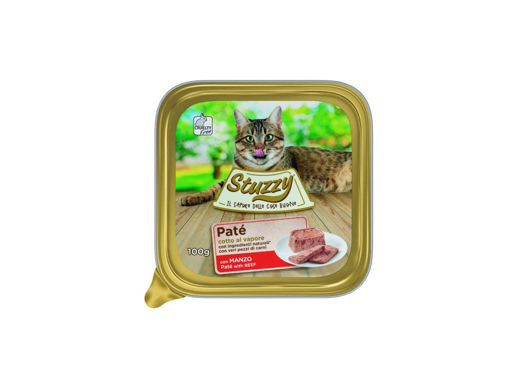 Paštika pro kočky Stuzzy Cat Adult Paté je plná šťavňatých kousků masa vařeného v páře a s dalším obsahem přírodních složek.