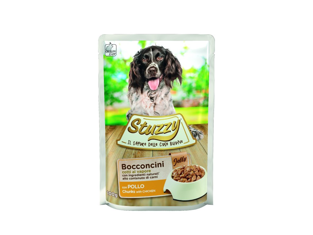 Kapsička pro psy Stuzzy Dog Adult je plná kousků masa vařeného v páře v lahodném želé.