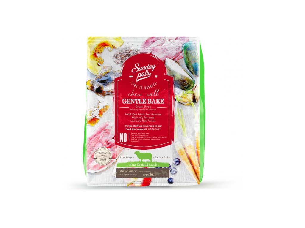 Kompletní a vyvážené psí krmivo SundayPets Dog Gentle Bake Lamb Senior. Pro psy náchylné k přibírání a starší psy malých a středních plemen od 7 let věkuKrmivo bez obilovin, bohaté na bílkoviny a s nízkým obsahem sacharidů. Věrně napodobuje přirozenou stravu bohatou na základní živiny nezbytné pro zdravý životní styl.