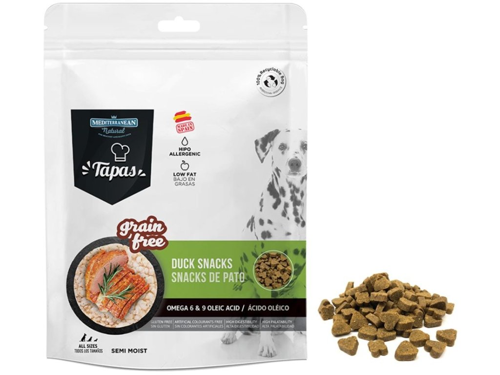 Hypoalergenní pamlsek Tapas snack duck obsahující přírodní antioxidanty, které zlepšují trávení (stimulují žluč) a zabraňují bakteriálním infekcím, napomáhají správnému průchodu trávicím ústrojím s přirozeným zdrojem Omega 9.