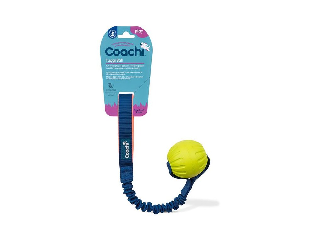 Hračka Coachi Tuggi Ball je pevný pěnový míček se speciální elastickou rukojetí určený psům, kteří se rádi přetahují o míč. Je vyrobený z odolné pěny, ale zároveň měkký, lehký, příjemný na skus a bezpečný pro zuby i dásně. Dostatečně dlouhá polstrovaná rukojeť usnadňuje manipulaci s hračkou a pružný popruh šetří krk vašeho psa i vaši paži. Míček lze nejlépe využít jako motivaci nebo odměnu při trénování poslušnosti, agility, při aportování, nácviku odložení, odvolání apod. Je ideální pomůckou k upoutání pozornosti psa, chcete-li jej například odnaučit nežádoucímu chování nebo zlepšit jeho přivolání.