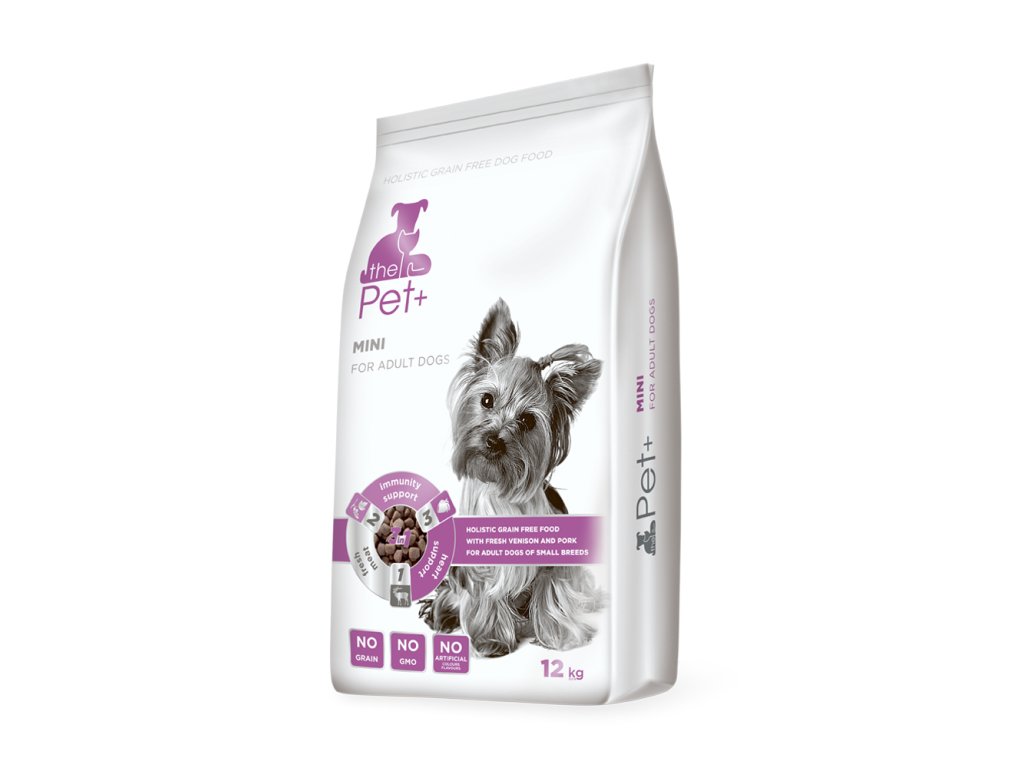 Kompletní krmivo pro dospělé psy malých plemen s čerstvou zvěřinou a vepřovým masem, které neobsahuje obiloviny. Krmivo ThePet+ Mini pro malé psy obsahuje čerstvou zvěřinu, která je výživná a lehce stravitelná, bohatá na bílkoviny a vitamíny.V krmivu obsažený černý rybíz podporuje imunitu a spolu s dalšími vitamíny podporuje obranyschopnost organismu.V krmivu je obsažen lososový olej pro zdravou a krásnou srst psa a L-carnitin pro podporu odbourávání tuku a posílení srdečního výkonu.Krmivo ThePet+ je skvělou volbou pro citlivější malé pejsky s běžnou aktivitu pohybu ve městě nebo na vesnici.