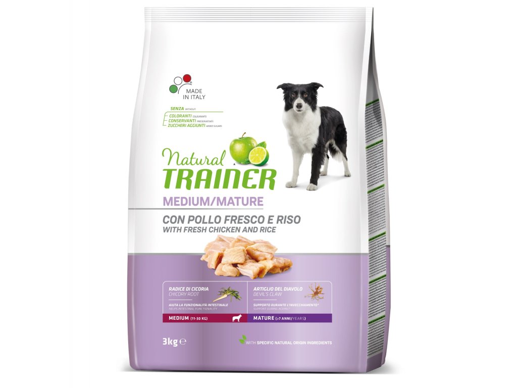 Krmivo speciálně navržené pro psí seniory středních plemen (11-30 kg). Starší psi nad sedm let mají specifické nároky na výživu, protože už obvykle nemají tolik pohybu a zároveň potřebují podpořit imunitu a bojovat proti stárnutí organismu. Krmivo Trainer Natural má lahodnou chuť čerstvého kuřete, které neodolá ani ten nejmlsnější psí jazýček, a zároveň dodá vašemu stárnoucímu mazlíčkovi vše, co potřebuje pro spokojený podzim života. Obsahuje ďáblův dráp, který pomáhá zpomalovat stárnutí a juku pro redukci zápachu exkrementů. Bez barviv, konzervantů a přidaných cukrů.