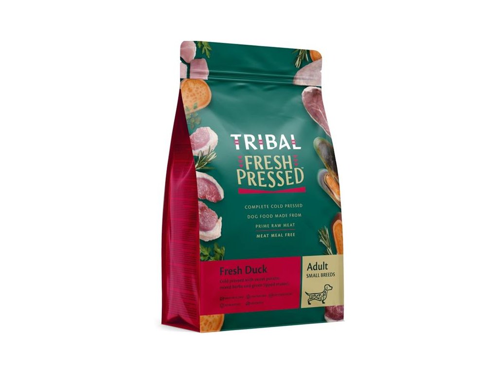 Receptura TRIBAL Fresh PressedTM Adult Small Breed Duck obsahuje 52 % čerstvé kachny, ryb a vajec + batáty, směs bylin, slávku zelenoústou a mnoho dalších hodnotných ingrediencí. Určená je především pro dospělé psy malých plemen.Krmiva TRIBAL Fresh PressedTM (zastudena lisovaná) kombinují prémiovou čerstvou drůbež (kuře, krůta, kachna) nebo ryby (losos) s vejci, batáty, bylinkami a velkorysým množstvím kloubní výživy tak, aby každá receptura byla vhodná pro psy všech kategorií, zejména však pro psy se sklony k alergickým reakcím a kožním či zažívacím potížím a pro vybíravé jedlíky.Speciální způsob přípravy lisováním za nízkých teplot pomáhá uchovat v krmivu maximum živin a chutí. Granule jsou také hutnější než běžné extrudy – v psím žaludku díky tomu nebobtnají a neplavou, ale ihned se začnou pozvolna rozpadat, aby uvolnily veškeré v sobě obsažené živiny. Protože jsou těžší než běžné granule, výrobce doporučuje odměřovat denní dávku pomocí váhy.Krmiva neobsahují žádnou masovou moučku, vepřové, hovězí, obiloviny ani hrášek. Veškeré maso pochází od zodpovědně hospodařících farmářů a rybářů.