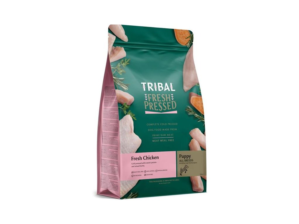 Receptura TRIBAL Fresh PressedTM Puppy Chicken obsahuje 56 % čerstvého kuřete, ryb a vajec + batáty, směs bylin a mnoho dalších hodnotných ingrediencí. Určená je především pro štěňata.Krmiva TRIBAL Fresh PressedTM (zastudena lisovaná) kombinují prémiovou čerstvou drůbež (kuře, krůta, kachna) nebo ryby (losos) s vejci, batáty, bylinkami a velkorysým množstvím kloubní výživy tak, aby každá receptura byla vhodná pro psy všech kategorií, zejména však pro psy se sklony k alergickým reakcím a kožním či zažívacím potížím a pro vybíravé jedlíky.Speciální způsob přípravy lisováním za nízkých teplot pomáhá uchovat v krmivu maximum živin a chutí. Granule jsou také hutnější než běžné extrudy – v psím žaludku díky tomu nebobtnají a neplavou, ale ihned se začnou pozvolna rozpadat, aby uvolnily veškeré v sobě obsažené živiny. Protože jsou těžší než běžné granule, výrobce doporučuje odměřovat denní dávku pomocí váhy.Krmiva neobsahují žádnou masovou moučku, vepřové, hovězí, obiloviny ani hrášek. Veškeré maso pochází od zodpovědně hospodařících farmářů a rybářů.