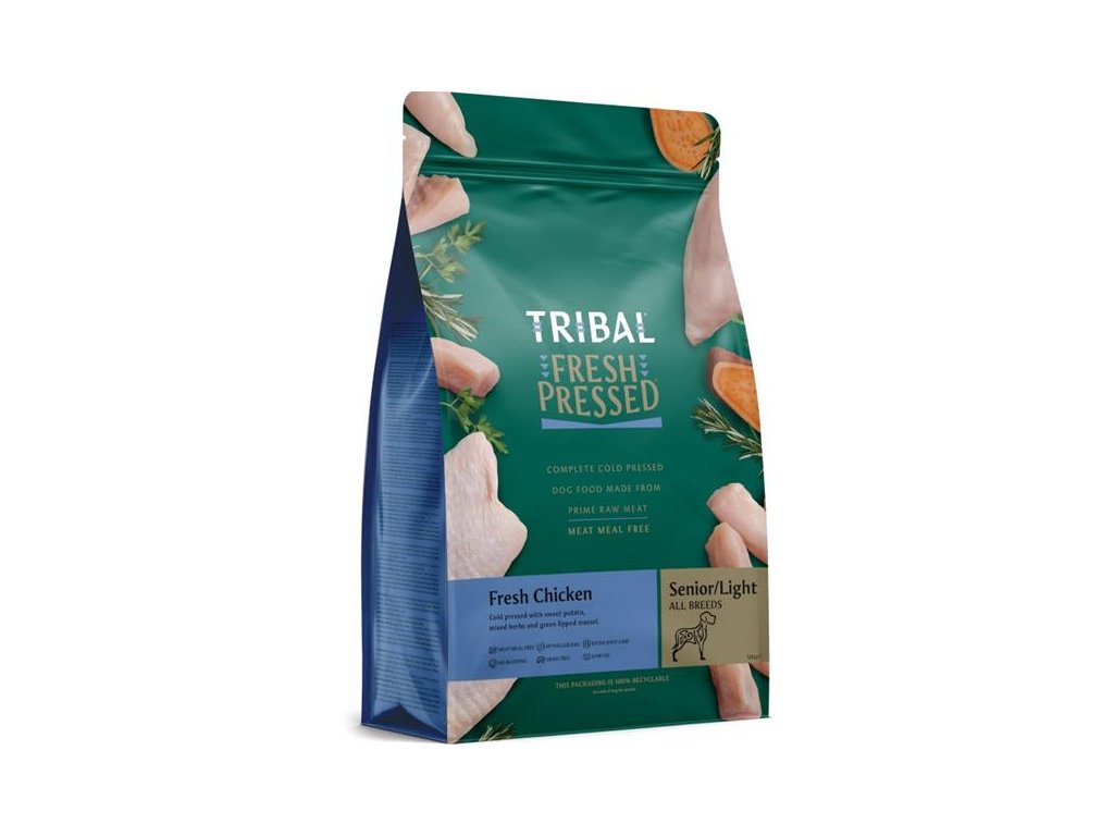 Receptura TRIBAL Fresh PressedTM Senior/Light Chicken obsahuje 47 % čerstvého kuřete, ryb a vajec + batáty, směs bylin, slávku zelenoústou a mnoho dalších hodnotných ingrediencí. Určená je především pro psí seniory a psy se sklony k nadváze.Krmiva TRIBAL Fresh PressedTM (zastudena lisovaná) kombinují prémiovou čerstvou drůbež (kuře, krůta, kachna) nebo ryby (losos) s vejci, batáty, bylinkami a velkorysým množstvím kloubní výživy tak, aby každá receptura byla vhodná pro psy všech kategorií, zejména však pro psy se sklony k alergickým reakcím a kožním či zažívacím potížím a pro vybíravé jedlíky.Speciální způsob přípravy lisováním za nízkých teplot pomáhá uchovat v krmivu maximum živin a chutí. Granule jsou také hutnější než běžné extrudy – v psím žaludku díky tomu nebobtnají a neplavou, ale ihned se začnou pozvolna rozpadat, aby uvolnily veškeré v sobě obsažené živiny. Protože jsou těžší než běžné granule, výrobce doporučuje odměřovat denní dávku pomocí váhy.Krmiva neobsahují žádnou masovou moučku, vepřové, hovězí, obiloviny ani hrášek. Veškeré maso pochází od zodpovědně hospodařících farmářů a rybářů.
