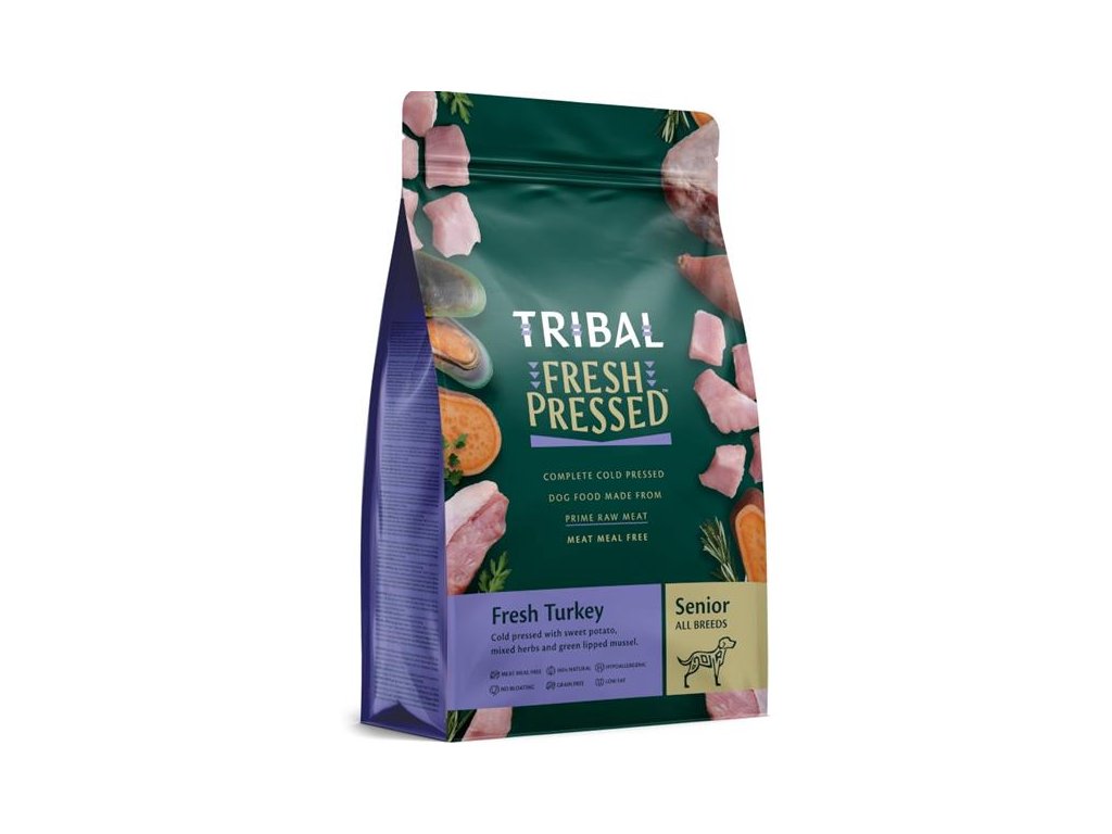 Receptura TRIBAL Fresh PressedTM Senior/Light Turkey obsahuje 46 % čerstvé krůty, ryb a vajec + batáty, směs bylin, slávku zelenoústou a mnoho dalších hodnotných ingrediencí. Určená je především pro psí seniory a psy se sklony k nadváze.Krmiva TRIBAL Fresh PressedTM (zastudena lisovaná) kombinují prémiovou čerstvou drůbež (kuře, krůta, kachna) nebo ryby (losos) s vejci, batáty, bylinkami a velkorysým množstvím kloubní výživy tak, aby každá receptura byla vhodná pro psy všech kategorií, zejména však pro psy se sklony k alergickým reakcím a kožním či zažívacím potížím a pro vybíravé jedlíky.Speciální způsob přípravy lisováním za nízkých teplot pomáhá uchovat v krmivu maximum živin a chutí. Granule jsou také hutnější než běžné extrudy – v psím žaludku díky tomu nebobtnají a neplavou, ale ihned se začnou pozvolna rozpadat, aby uvolnily veškeré v sobě obsažené živiny. Protože jsou těžší než běžné granule, výrobce doporučuje odměřovat denní dávku pomocí váhy.Krmiva neobsahují žádnou masovou moučku, vepřové, hovězí, obiloviny ani hrášek. Veškeré maso pochází od zodpovědně hospodařících farmářů a rybářů.