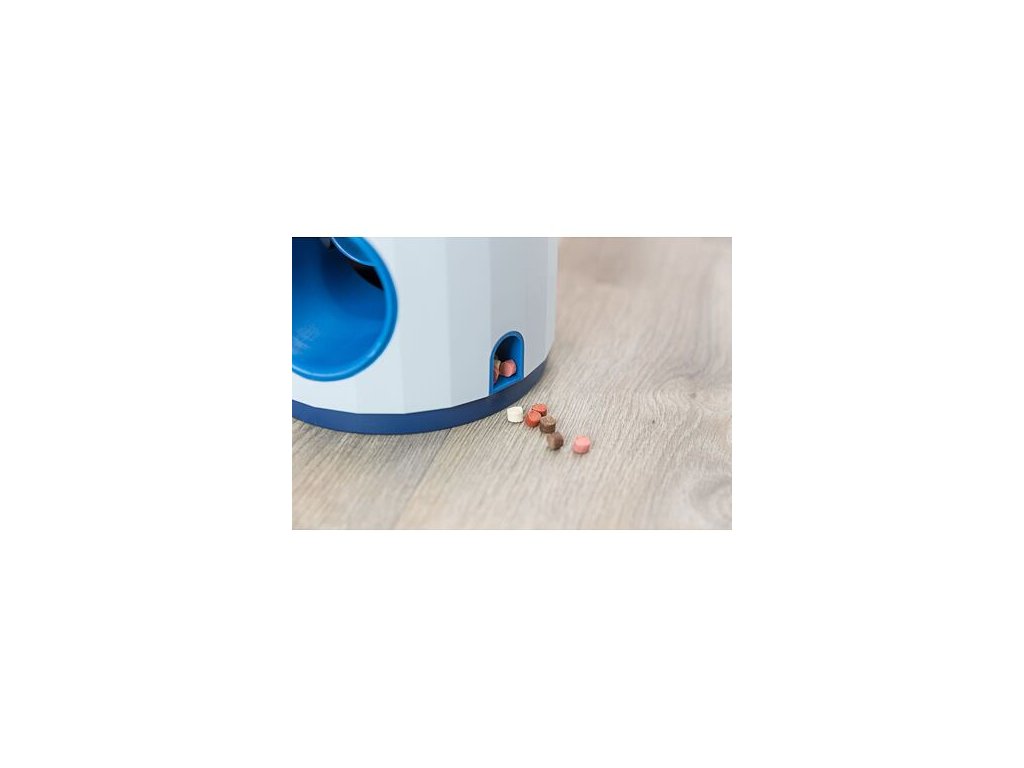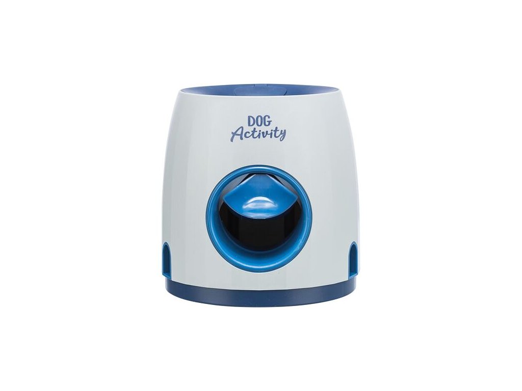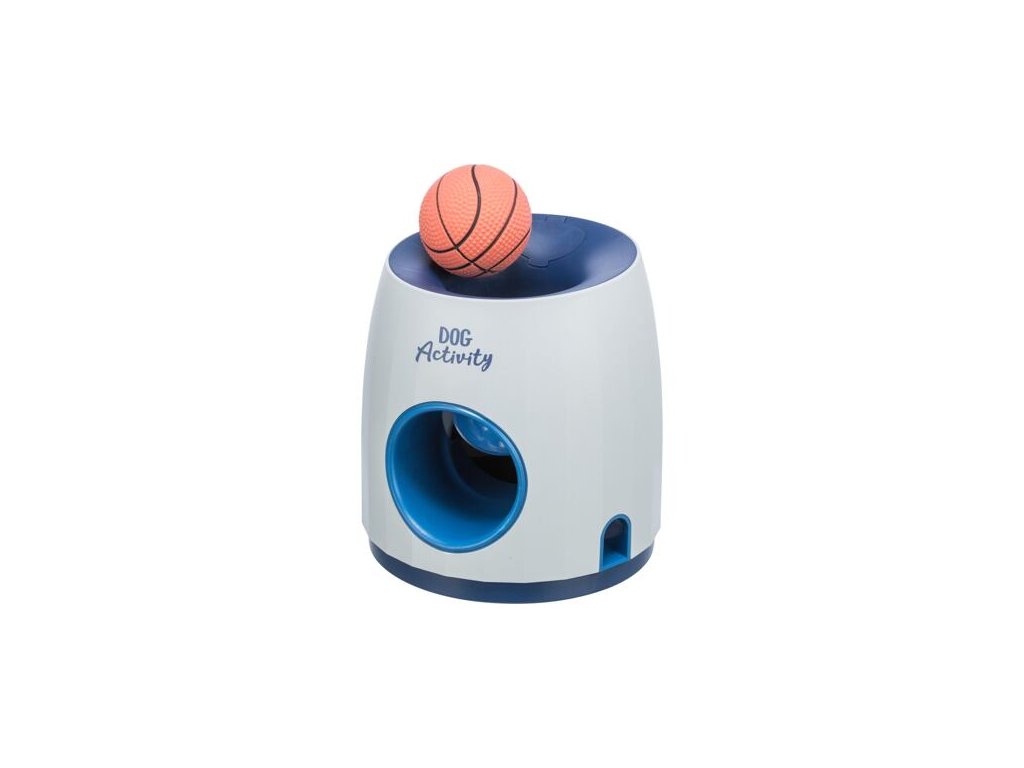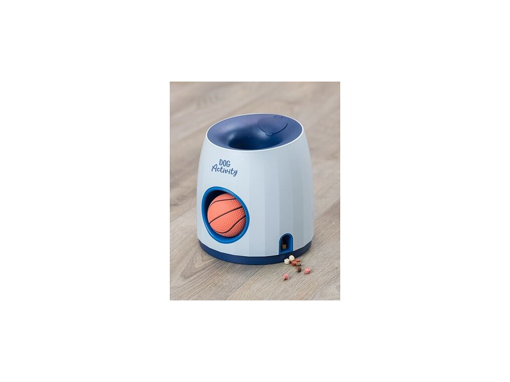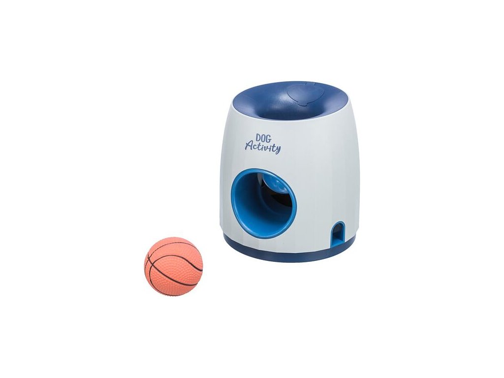 mechanický dávkovač vydá pamlsek v souvislosti na splnění úkolu, vhození míčku do otvoru