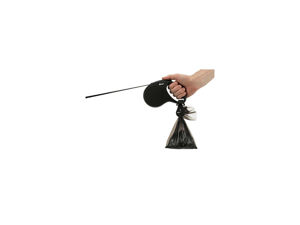 vhodné pro použité i nepoužité sáčky. Snadné zavěšení na vodítko nebo i rukojeť flexi vodítka. Pro rychlé vyjmutí sáčku bez nutnosti rozvazovat uzel
