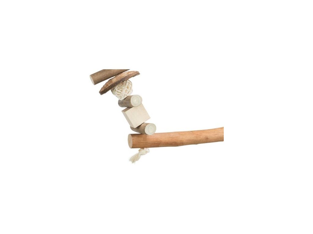 Materiálově pestrá houpačka pro zavěšení do voliéry. Různorodost použitých materiálů bude papoušky lákat ke zkoumání a okusování