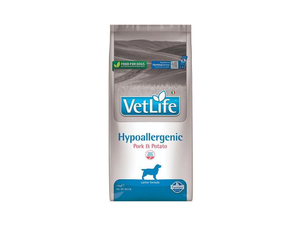 Farmina Vet Life Hypoallergenic Pork & Potato je kompletní suché dietetické krmivo pro psy určené ke snížení výskytu potravinových alergií a nesnášenlivostí (intolerancí). Granule se používají také pro podporu správných funkcí kůže v případě kožních poruch a nadměrné ztráty srsti. Jediným zdrojem proteinů v krmivu je dehydrovaný vepřový protein a jediným zdrojem sacharidů batáty, čímž je eliminována nesnášenlivost vůči jiným složkám potravy.