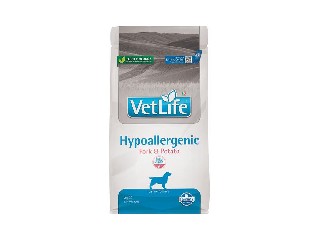 Farmina Vet Life Hypoallergenic Pork & Potato je kompletní suché dietetické krmivo pro psy určené ke snížení výskytu potravinových alergií a nesnášenlivostí (intolerancí). Granule se používají také pro podporu správných funkcí kůže v případě kožních poruch a nadměrné ztráty srsti. Jediným zdrojem proteinů v krmivu je dehydrovaný vepřový protein a jediným zdrojem sacharidů batáty, čímž je eliminována nesnášenlivost vůči jiným složkám potravy.
