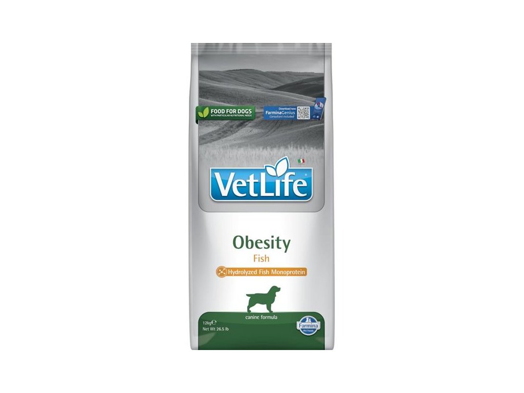 Farmina Vet Life Obesity Fish je kompletní suché dietetické krmivo pro dospělé psy vyvinuté speciálně za účelem snížení nadměrné tělesné hmotnosti. Granule jsou díky nízkému obsahu tuků a cukrů ideální pro psy trpící obezitou. Zdroji sacharidů v krmivu jsou špalda a oves, původní pěstované obilniny s nízkým glykemickým indexem, které umožňují postupné uvolňování energie během dne.