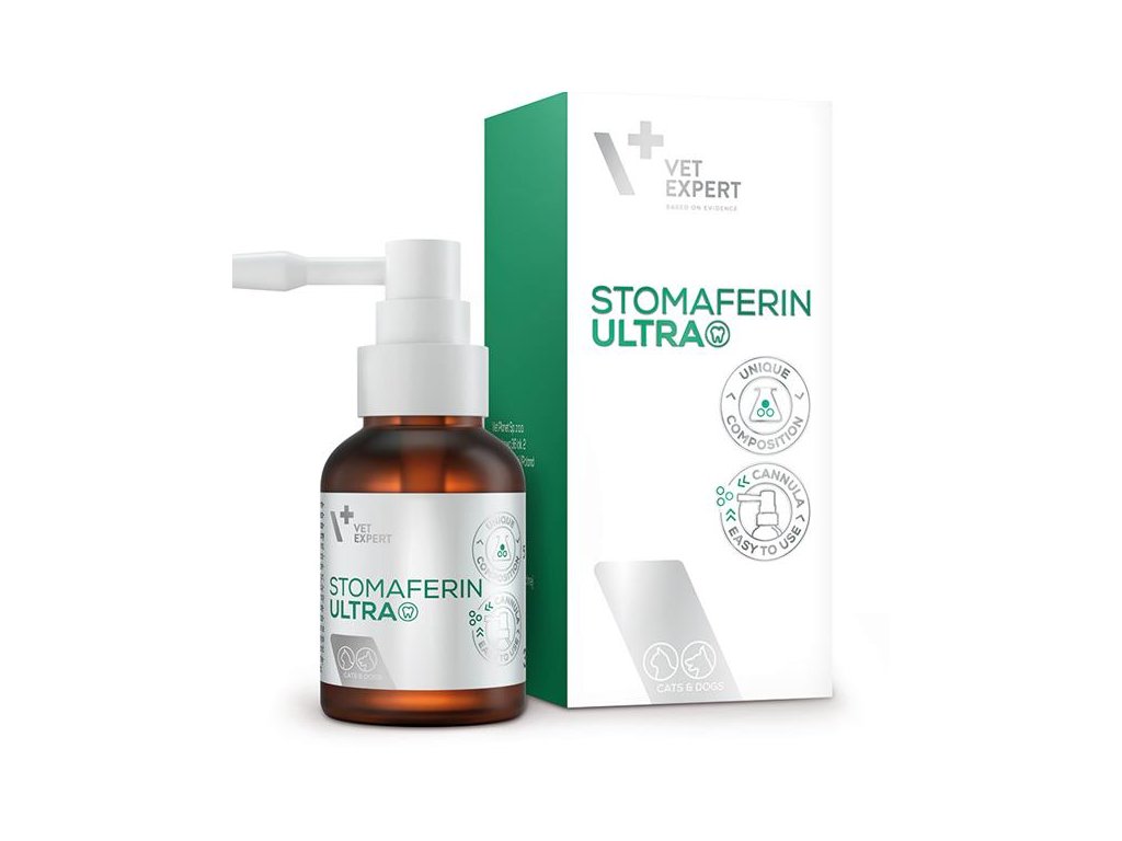 Speciální přípravek pro lokální aplikaci na sliznici ústní dutiny psů a koček. Díky speciálně sestavenému komplexu aktivních složek chrání Stomaferin Ultra před přilnutím bakterií na povrch zubů, čímž brání jejich růstu a kolonizaci. Eliminuje nepříjemný zápach z ústní dutiny, pomáhá udržet normální stav ústní mikroflory a zpomaluje množení bakterií. Chrání a podporuje regeneraci sliznic, zejména po dentálním ošetření.