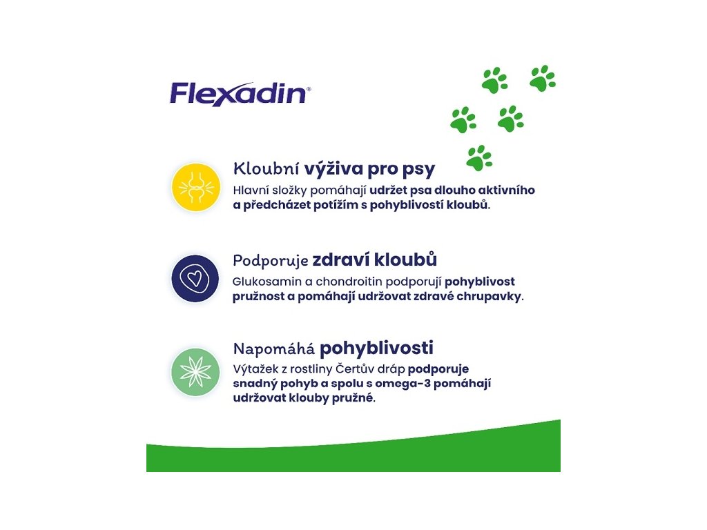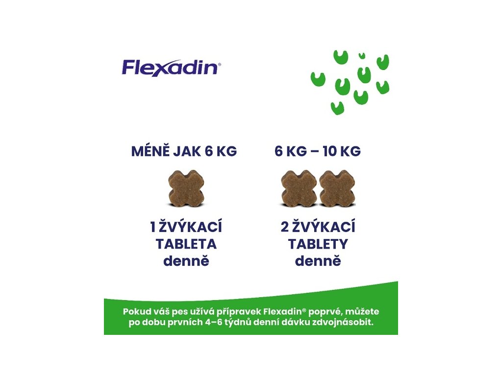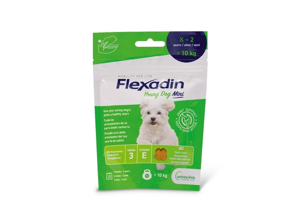 Flexadin Young Dog Mini je inovativní kloubní přípravek pro mladé psy menších plemen ve věku od 6 měsíců do 2 let, vyvinutý k podpoře zdraví jejich kloubů a správné funkce chrupavek. Díky unikátní kombinaci pěti vysoce kvalitních složek předchází možným problémům s pohyblivostí kloubů. V chutných žvýkacích tabletách najdete látky, které jsou klíčové pro zdraví kloubní chrupavky, jako je glukosamin a chondroitin sulfát, spolu s omega-3 mastnými kyselinami, manganem pro správný růst chrupavek, vitamínem E s antioxidačními vlastnostmi a rostlinným Ďáblův drápem (Harpagofyt ležatý), který má protizánětlivé účinky. Flexadin Young Dog Mini je tak skvělým řešením pro dlouhodobou péči o klouby vašeho malého psa.