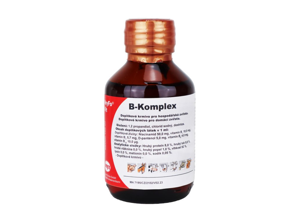 Doplňkové látky:1 ml obsahuje:50 mg niacinamidu,10 mg vitamínu B1,5,7 mg vitamínu B2,5 mg dexpanthenolu,4 mg vitamínu B6,10µg vitamínu B12,kyselina citrónová.