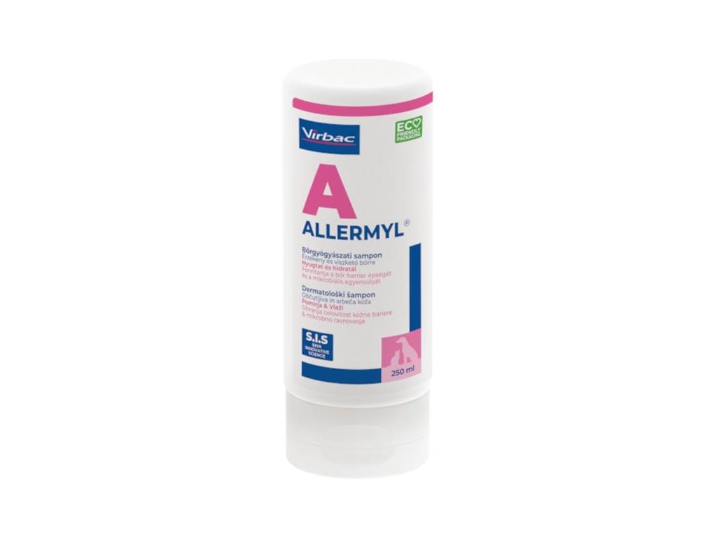 Allermyl je jemný, hypoalergenní dermatologický šampon bez mýdla určený k častému použití a optimalizaci stavu kůže a srsti psů a koček všech věkových kategorií s citlivou a svědivou kůží. Obsahuje technologii S–I–S (Skin–Innovative–Science) a Skin Lipid Complex (komplex kožních lipidů).
