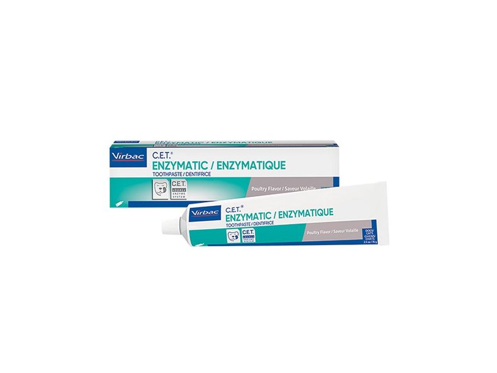 Virbac C.E.T. zubní enzymatická pasta pro psy a kočky s drůbeží příchutí zvyšuje přirozenou obranyschopnost ústní dutiny, odstraňuje zápach z úst, odstraňuje plak a redukuje tvorbu zubního kamene.