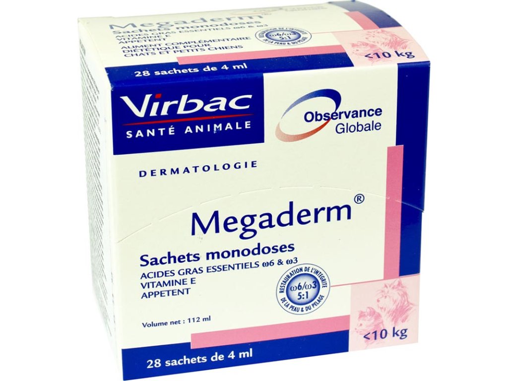 MEGADERM je potravní doplněk s obsahem esenciálních mastných kyselin (EFAs) náležejících do rodiny omega 6 (Ω6) a omega 3 (Ω3) v optimálních množstvích a poměrech (5:1). MEGADERM pomáhá při tlumení kožních poruch, zejména v případě alergií. Účinkuje na 2 úrovních, které se vzájemně doplňují:
