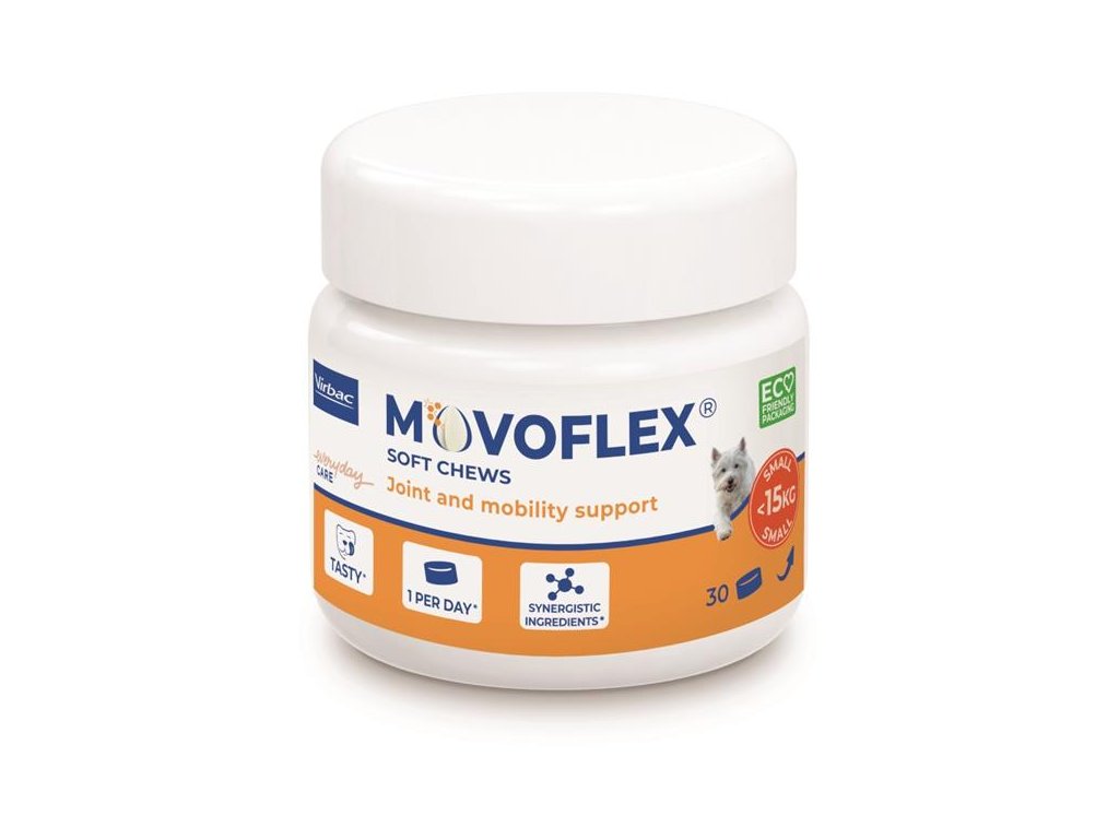 Nová generace chondroprotektiv ve formě žvýkacích tablet pro malé psy (do 15kg).MOVOFLEX® Soft Chews mají výjimečné složení vzájemně synergických, vysoce kvalitních složek, které pomáhají udržovat zdraví a pohyblivost kloubů u psů všech věkových kategorií.