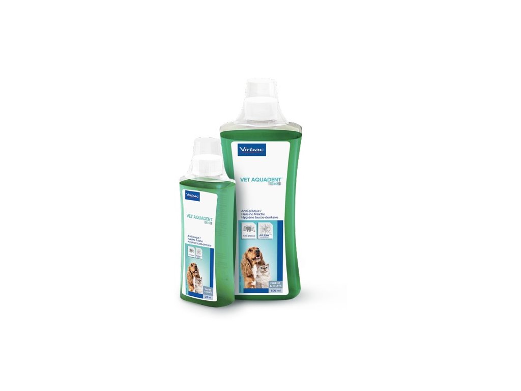 Virbac VetAquadent je ústní voda pro psy a kočky. Jde o osvěžující, ochucený roztok do pitné vody, který zabraňuje tvorbě plaku a zápachu z tlamy.