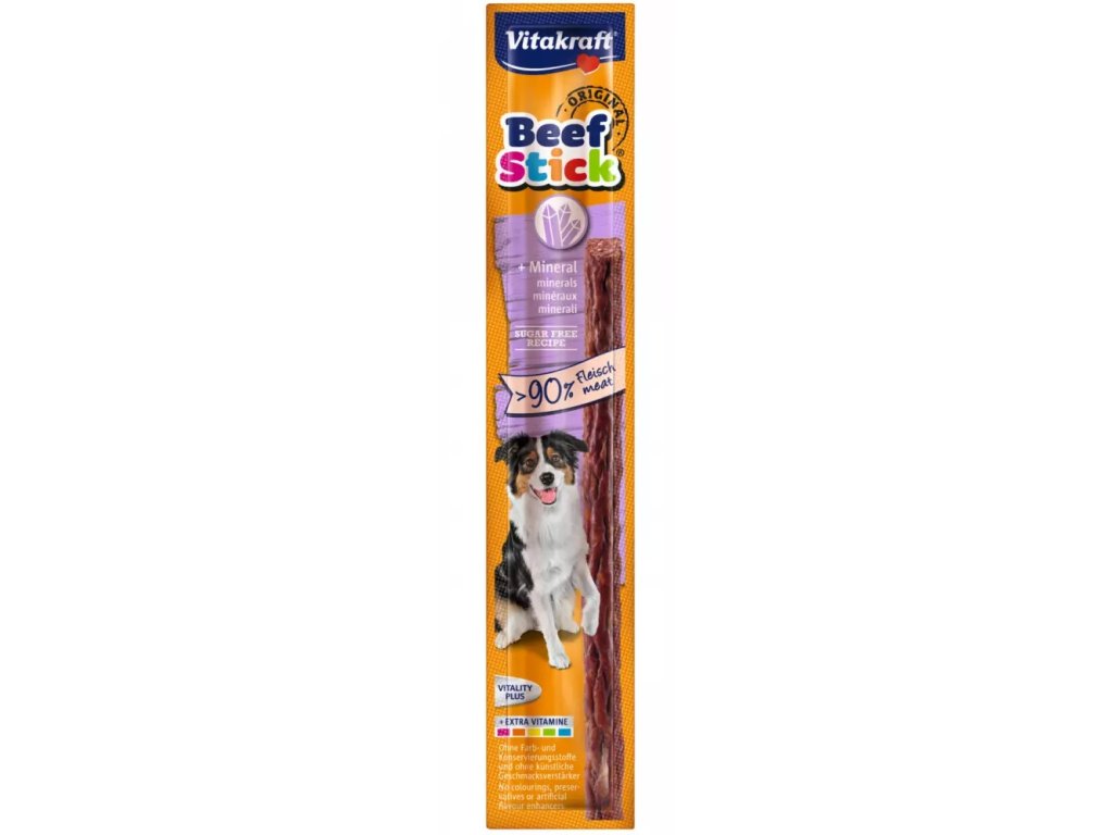 Oblíbené masové tyčinky Vitakraft Beef Stick s hovězím masem (vysoký obsah masa). Pamlsek je určen pro štěňata a mladé psy. Ve složení nejsou obsažena žádná umělá dochucovadla, barviva a konzervanty.