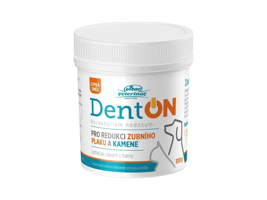 Přírodní přípravek DentOn je jemný prášek z mořské řasy Ascophyllum nodosum. Výrazně pomáhá v redukci zubního plaku a kamene, navíc snižuje zápach z tlamy psů a koček. Přípravek přidávejte do stravy vašich domácích mazlíčků. Preparát působí přímo v zažívacím traktu zvířete, odkud se následně dostává do krevního řečiště, poté do slin a tím velmi účinně působí na zuby a dásně. Významně ovlivňuje schopnost zachycování bakterií způsobujících zubní plak a změkčuje existující zubní kámen, který většinou sám odpadne nebo je velmi snadno odstranitelný. Přípravek neobsahuje umělá barviva, lepek, cukr. Bez genetických modifikací.