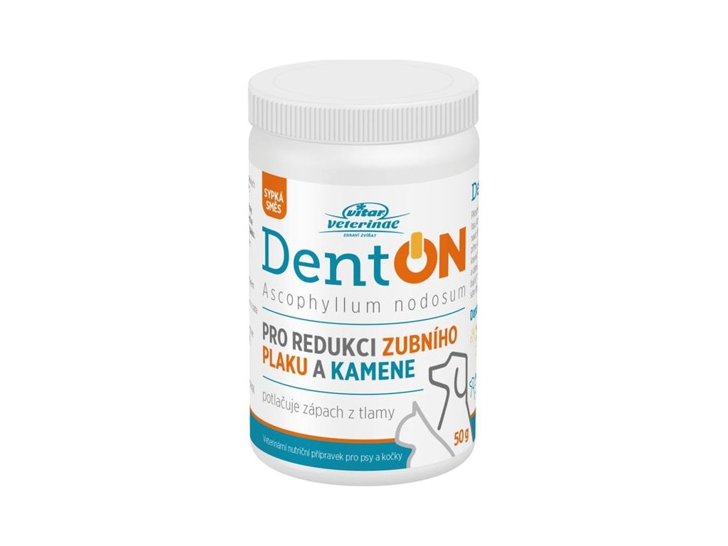 Přírodní přípravek DentOn je jemný prášek z mořské řasy Ascophyllum nodosum. Výrazně pomáhá v redukci zubního plaku a kamene, navíc snižuje zápach z tlamy psů a koček. Přípravek přidávejte do stravy vašich domácích mazlíčků. Preparát působí přímo v zažívacím traktu zvířete, odkud se následně dostává do krevního řečiště, poté do slin a tím velmi účinně působí na zuby a dásně. Významně ovlivňuje schopnost zachycování bakterií způsobujících zubní plak a změkčuje existující zubní kámen, který většinou sám odpadne nebo je velmi snadno odstranitelný. Přípravek neobsahuje umělá barviva, lepek, cukr. Bez genetických modifikací.