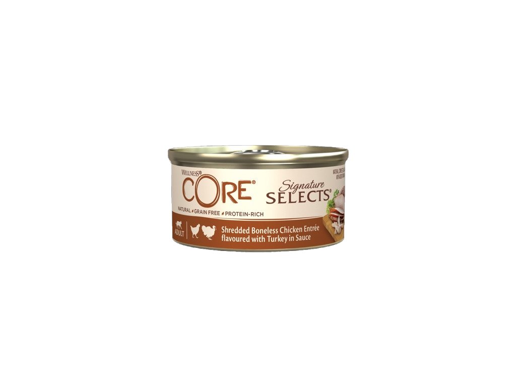 Wellness CORE Signature Selects je přírodní, inovativní a zdravé mokré krmivo bez obilovin pro dospělé kočky. Wellness CORE Signature Selects nabízí tři různé textury, které vaší kočce dodají rozmanitost, po které touží. Jsou to trhané kousky, velké kusy a malé kousky velikosti vloček. Receptury jsou založeny na volbě kvalitních ingrediencí, které vaší kočce zaručí vysoký obsah bílkovin a potřebné vitaminy. Kompletní krmivo v praktických konzervách vám zaručí pohodlnou manipulaci, ideální dávkování a především kvalitní obsah.