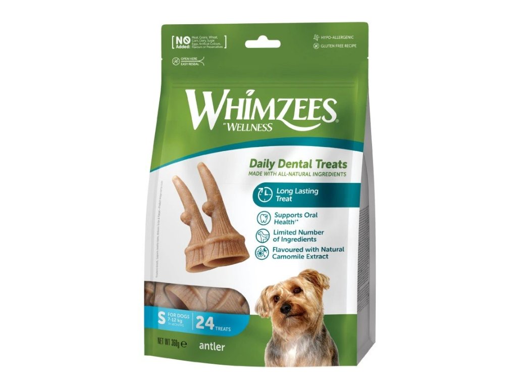 Dentální pamlsek ve tvaru parohu udržuje vašemu psovi svěží dech, zdravé dásně a čisté zuby. Paroh vašeho psa na dlouho dobu zabaví, díky dlouhému žvýkaní. Kousáním si pes procvičuje žvýkací svaly, přičemž se mu uvolňují endorfiny, které se vyplavují během žvýkání a působí na psa relaxačně. Tvar pamlsku není náhodný, ale zcela promyšlený, Whimzees parohy mají speciální drážky a výstupky, takže se dostanou i do těch nejužších míst v tlamě vašeho mazlíčka. Díky tomu se lehce odstraní ze zubů zubní plak a nevytvoří se tak ani zubní kámen, se kterým se při špatné ústní hygieně můžeme potýkat. Tyto vegetariánské, zcela přírodní žvýkací parohy jsou zcela jedlé a snadno stravitelné. Dentální pamlsek se vyrábí udržitelným způsobem za použití těch nejlepších ingrediencí a dodržuje nejvyšší standardy kvality. Pamlsek je vyrobeno pouze ze šesti, zcela přírodních, klíčových složek.