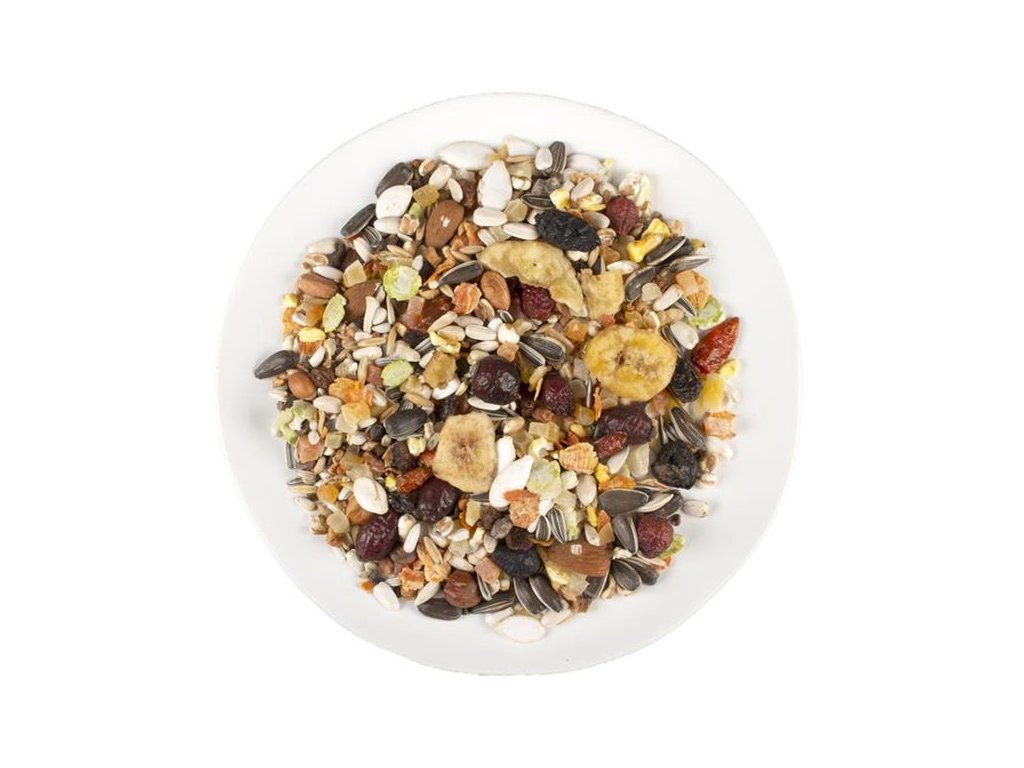 Složení: ovoce 40 % (10 % rozinky, 8 % papája, 6 % sušený banán, 5 % sušené šípky, 4 % sušený ananas), semena, obiloviny, ořechy, zelenina, oleje a tuky.