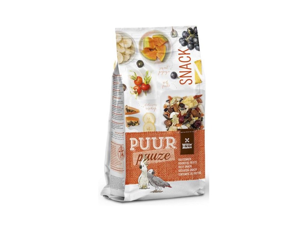 PUUR pauze Fruit Snack je lahodná směs plná přírodních ingrediencí určená pro středně velké a velké papoušky. Bohatá směs s ovocem, semeny a ořechy nabízí pestrou paletu chutí pro skutečný gurmánský požitek. Papoušky potěší, zabaví a díky obsahu aminokyselin (methioninu a cysteinu) také podpoří kvalitu jejich peří.Vyrobeno v Holandsku společností Witte Molen s tradicí od roku 1740.
