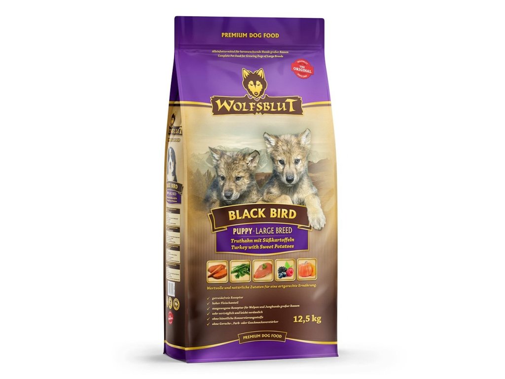 Vlci loví svou kořist od Skalistých hor Severní Ameriky, arktické tundry, hor a lesů Evropy až po pouště a stepi střední Asie. To jim dodává maso a vnitřnosti bohaté na živiny, ale také zeleninu, ovoce, bobule, kořeny a bylinky z obsahu žaludku kořisti. Obilí zde není zahrnuto. Vlk tak přijímá potřebné vitamíny, minerály, stopové prvky, enzymy a druhotné rostlinné látky. Vzhledem k tomu, že vlk je předkem všech psů, naše suché krmivo pro psy Wolfsblut je založeno na přirozených stravovacích návycích vlka. Obsahuje hodně masa nebo ryb v kombinaci se superpotravinami, které obsahují hodnotné ingredience – stejně jako v přírodě, bez obilovin. Náš výběr výjimečných druhů masa a superpotravin bohatých na živiny vychází z vlčích biotopů a jejich pestré stravy. Wolfsblut nabízí každému psovi druhově vhodnou a originální stravu a díky rozmanitosti odrůd si každý najde něco, co snese. Receptura suchého krmiva BLACK BIRD Puppy Large Breed kombinuje výživu vlků s nejnovějšími vědeckými poznatky o správné výživě psů.